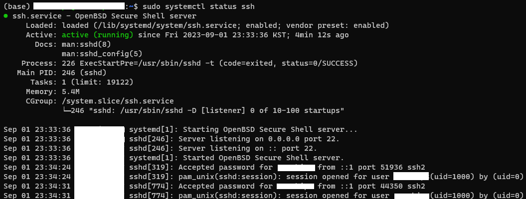 다음과 같이 ssh 서비스 상태가 출력된다.